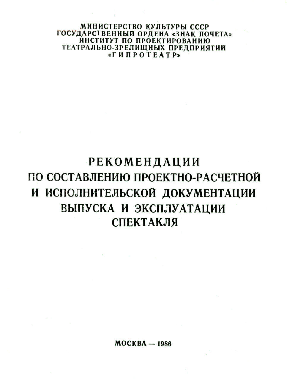 | РЕКОМЕНДАЦИИ ПО СОСТАВЛЕНИЮ ПРОЕКТНО-РАСЧЕТНОИ И ИСПОЛНИТЕЛЬСКОЙ ДОКУМЕНТАЦИИ ВЫПУСКА И ЭКСПЛУАТАЦИИ СПЕКТАКЛЯ |